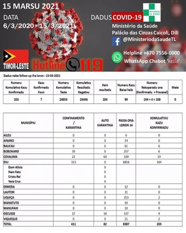 DILI: Sala Situasaun Sentru Inregradu Jestaun Krize (SIJK) relata ohin (28/07), ekipa konjunta saúde deteta tan kazu foun hamutuk na’in 148, kompostu husi Munisipiu Ermera 123, Dili 18, Baucau 2, Ainaro 1, Covalima 1 no Manufahi 1.